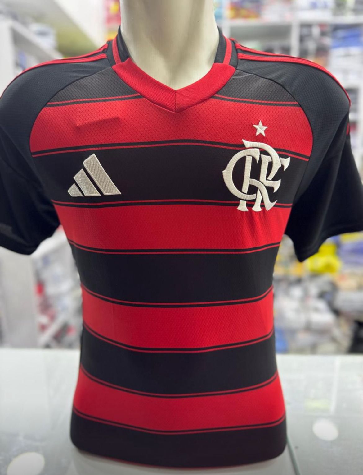 No lado esquerdo do peito fica o escudo do Flamengo, formado pelas iniciais CRF, representando a história e o orgulho do clube. No lado direito geralmente aparece o logotipo da marca esportiva Adidas, responsável pela produção do uniforme.