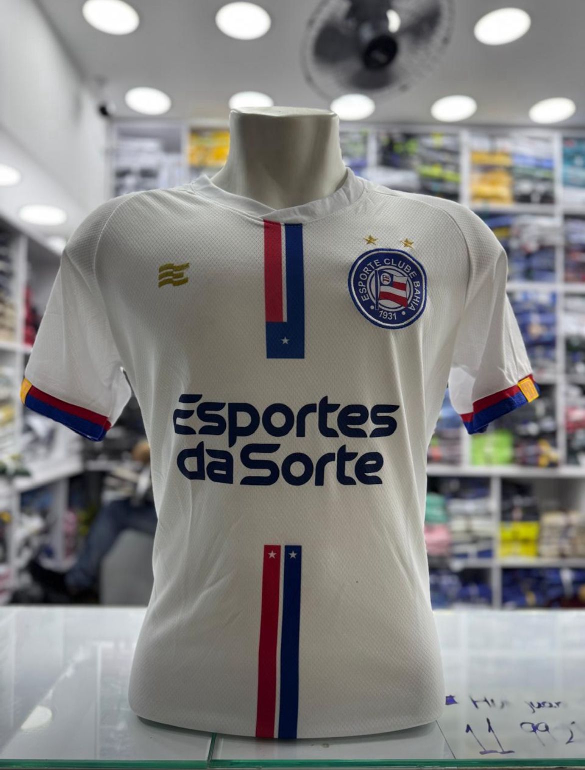 Escudo: o escudo do Bahia aparece no lado esquerdo do peito, simbolizando orgulho e tradição do time.