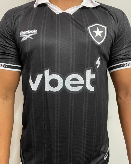 A camisa principal do Botafogo possui um estilo elegante e marcante. Ela apresenta listras verticais pretas e brancas, que dão ao uniforme um visual forte e tradicional. No lado esquerdo do peito está o escudo do Botafogo, representado por uma estrela branca solitária, conhecida como “Estrela Solitária”, símbolo do clube.