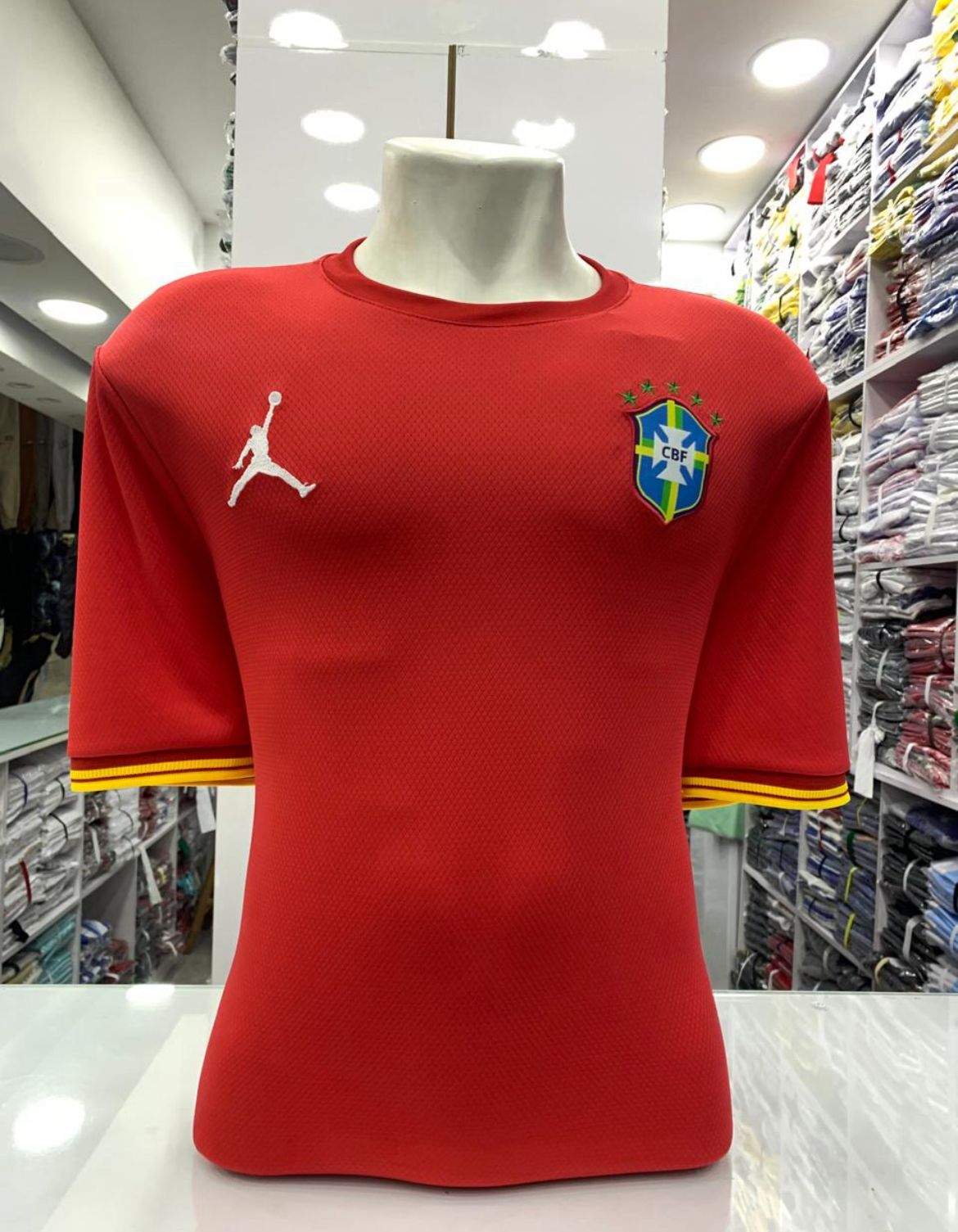 A camisa principal da Seleção Brasileira é conhecida pela sua cor vermelha vibrante, acompanhada de detalhes em verde nas mangas ou na gola. No lado esquerdo do peito fica o escudo da Confederação Brasileira de Futebol, com cinco estrelas acima, que simbolizam os títulos do Brasil nas Copas do Mundo.
