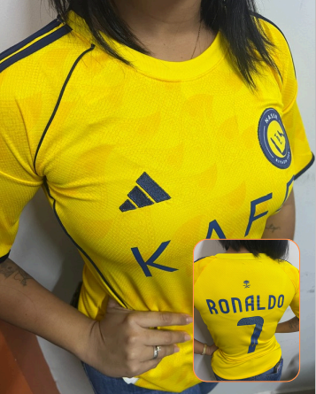 O design destaca as cores oficiais amarelo e azul do clube, além do escudo do Al-Nassr FC estampado na parte frontal, simbolizando tradição, paixão e a história do time. A peça conta ainda com mangas curtas e gola confortável, garantindo praticidade e estilo esportivo.