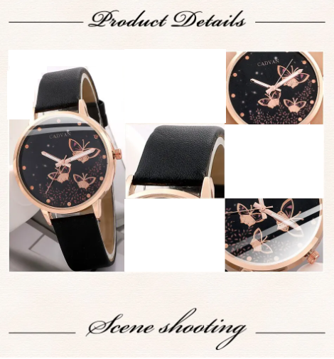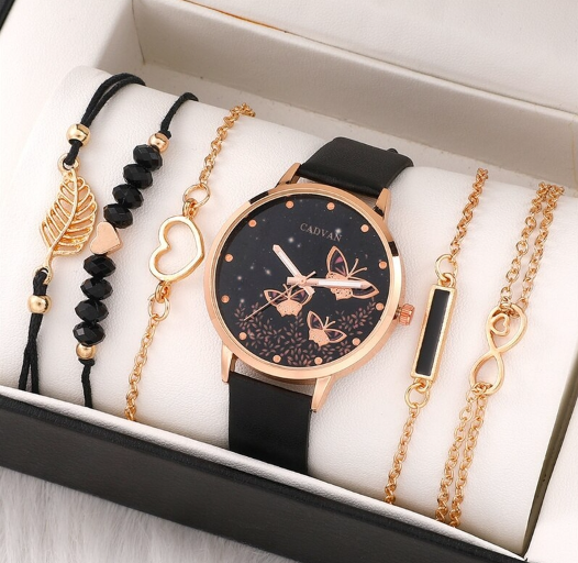 É um perfeito relógio com acabamento de primeira linha, na cor dourado e preto mostra um toque de Luxo e elegância em cada detalhe das pulseiras e também do relógio. São cinco pulseiras incríveis para você combinar da forma que bem entender. Relógio nos detalhes de borboleta remetem uma suavidade ao colocar ele no seu braço. É uma grande peça para você presentear a pessoa que você ama.